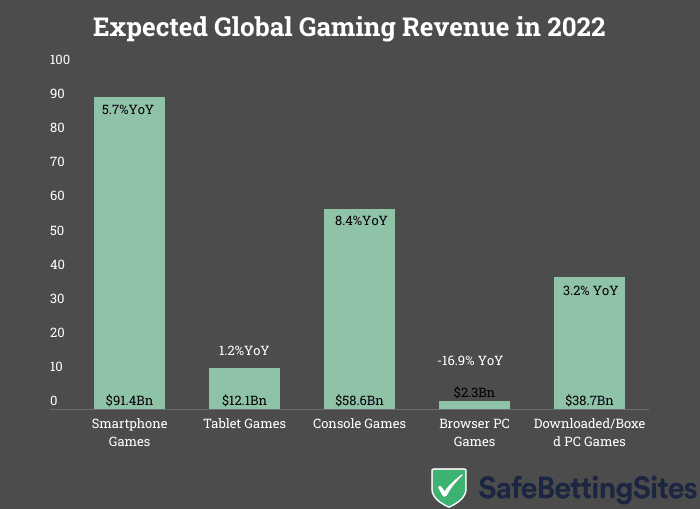 In 2022, console games are expected to make $58.6Bn in revenues – an impressive year on year improvement of 8.4%. In comparison, Smartphone games are set to bring in $91.4Bn, but only with a year on year gain of 5.7%.