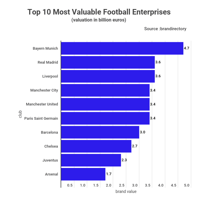Bayern Munich is the most valuable football enterprise globally. The Bayern Munich brand is worth an astonishing 4.7 billion Euros, which is over a billion euros more than the second-placed Real Madrid. Bayern Munich has built up its brand value through a long history of success, both on the pitch and off it.