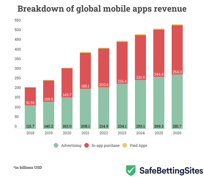 As per the data available on Statista, the global app market is expected to produce $420.73 billion in revenue in 2022. The majority of the revenue is expected to come from advertising. As per the figures, mobile apps will earn $214.9 billion in advertising, accounting for 51% of the total revenue. In-app purchases would contribute $200.6 billion in revenue, whereas revenue from paid apps should account for only $5.23 billion. It must be noted that most of the paid app revenue comes from games.
