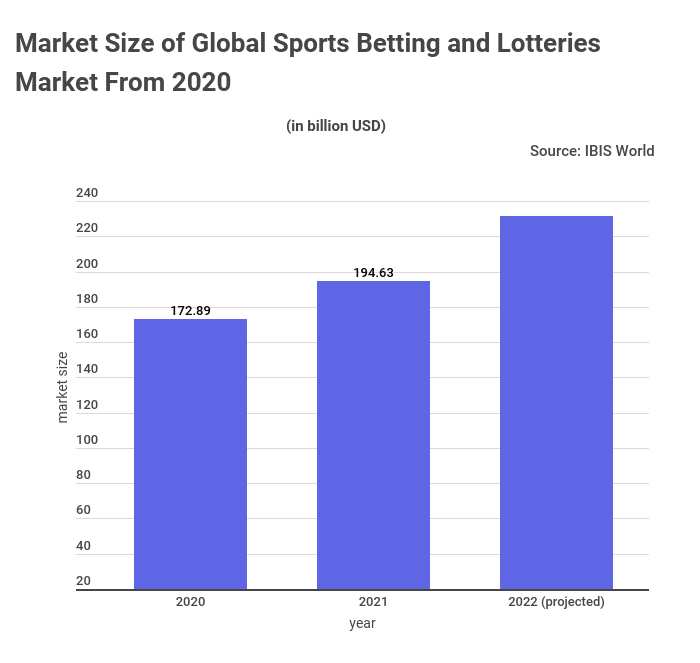 The global sports betting and lottery market has seen unprecedented growth in recent years. According to Safebettingsites analysis, the sector’s market size grew from $172.89B in 2020 to $194.63B in 2021, a jump of 13%. And the trend looks to continue, with projections indicating it will reach $231B by 2022.