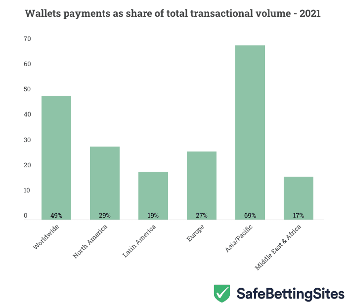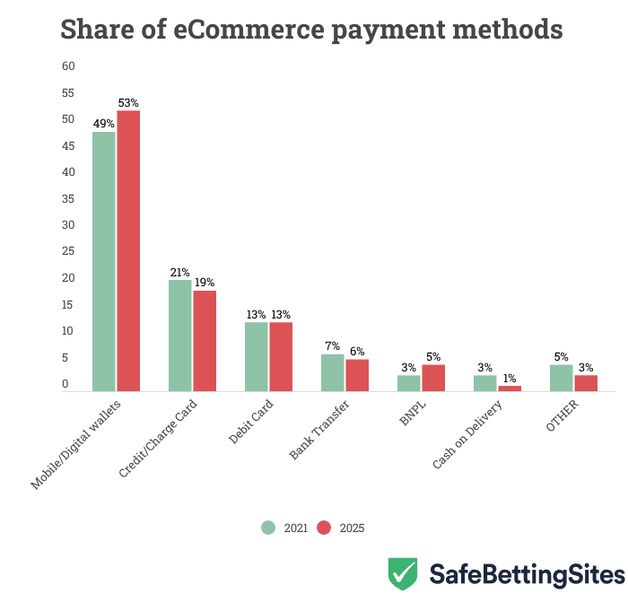 Mobile/digital wallets have become a mainstay of online payments within a short period of time. According to the numbers presented by SecureBettingSites.com, mobile/digital wallets will account for 53% of the entire e-commerce transactional volume by 2025.