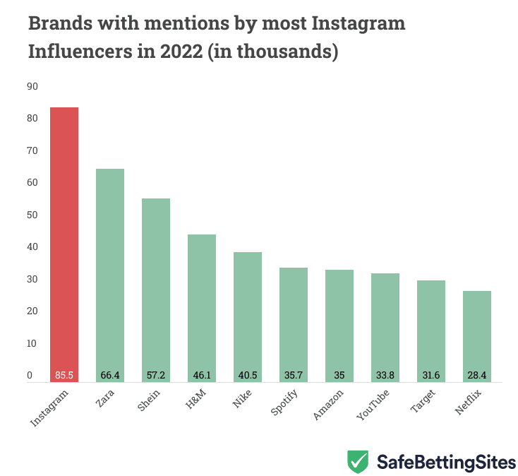 Influencer marketing on social media has become essential for multiple brands in recent years. According to the numbers presented by SecureBettingSites.com, the Spanish fashion brand Zara (besides Instagram itself) was the most popular among Instagram influencers in 2022. Overall, Zara was mentioned by 664,000 Instagram influencers past year.