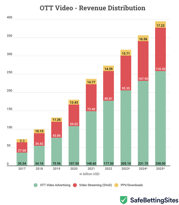 In recent years, video streaming platforms have substantially shifted towards advertising-based revenue models. According to the numbers presented by SecureBettingSites.com, OTT video platforms generated $177.5 billion in revenue from advertisements in 2022. Ad revenue accounted for 65% of the total revenue generated by OTT video platforms last year.
