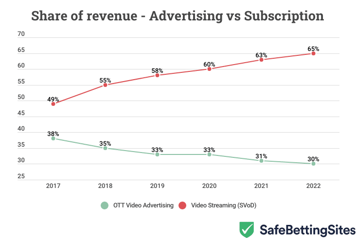 As per the latest Statista report on OTT viewing, OTT platforms have started making more money through ads in recent years. In 2017, ads brought in $35.54 billion in revenue, whereas subscription-based VoD services brought in $27.68 billion. Thus, in 2017, ad income contributed to 49% of the total revenue, and subscription fees accounted for 38%.