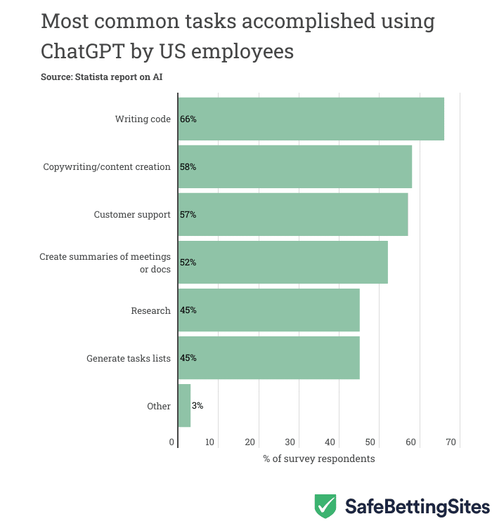The recent launch of ChatGPT has launched a serious discussion regarding the broader use of Artificial Intelligence. ChatGPT has become a useful tool in various lines of work in a short time since its release. According to the numbers presented by SecureBettingSites.com, ChatGPT has been most commonly used for coding, with 66% of users using it to write codes.