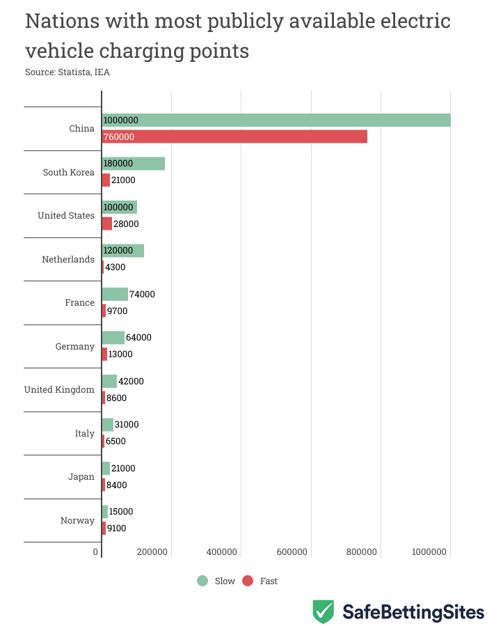 There has been a massive push towards electric vehicles globally in recent years. However, when it comes to setting up the infrastructure for a shift towards the electric-powered automobile industry, China is doing far better than other nations. According to the numbers presented by SecureBettingSites.com, China has already installed 1.76 million functioning publicly available electric vehicle chargers.