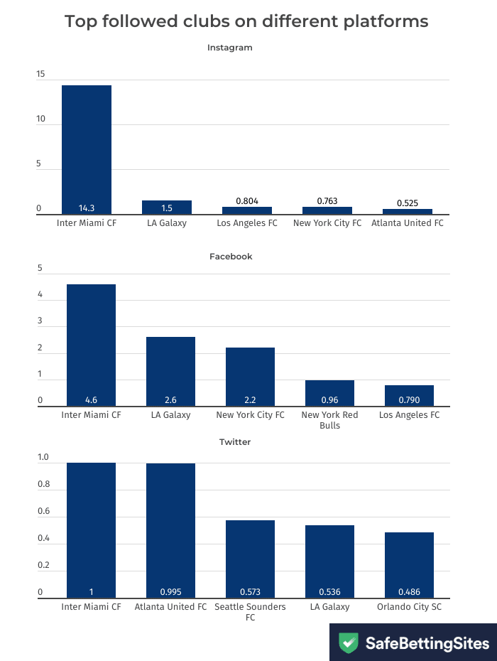 The gulf between Inter and other MLS clubs is much smaller on Facebook and Twitter. On Facebook, Inter Miami has 4.6m followers, to be the most popular MLS side. LA Galaxy is the second most popular, with 2.6m followers.