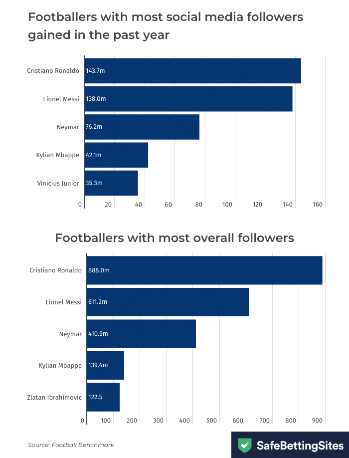 According to the social media data on Football Benchmark, Cristiano Ronaldo gained the most social media followers last year among all footballers. The Portuguese star added 144m new followers to take his total count to 888 million followers. The analysis covered popular social media platforms such as Facebook, Instagram, Twitter, YouTube, TikTok, and Weibo (during a year period ending on 3rd September).