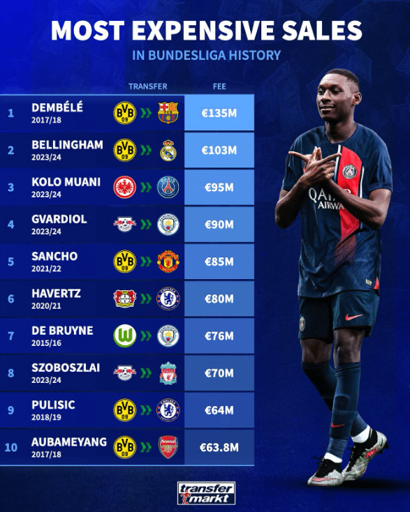 The recent near record for a Bundesliga transfer was set in 2023/24. Real Madrid purchased Jude Bellingham from Borrusia Dortmund for €103 million. Dembélé’s transfer fee surpassed this mark by a significant margin.