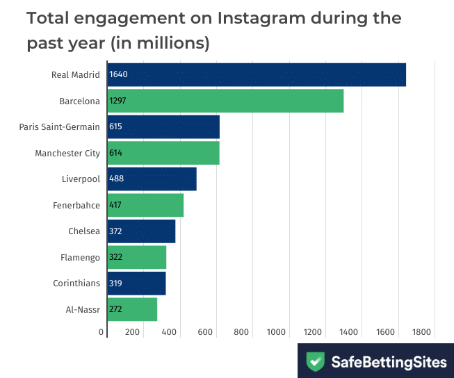 Al Nassr completed the top ten with 272m engagements on Instagram.