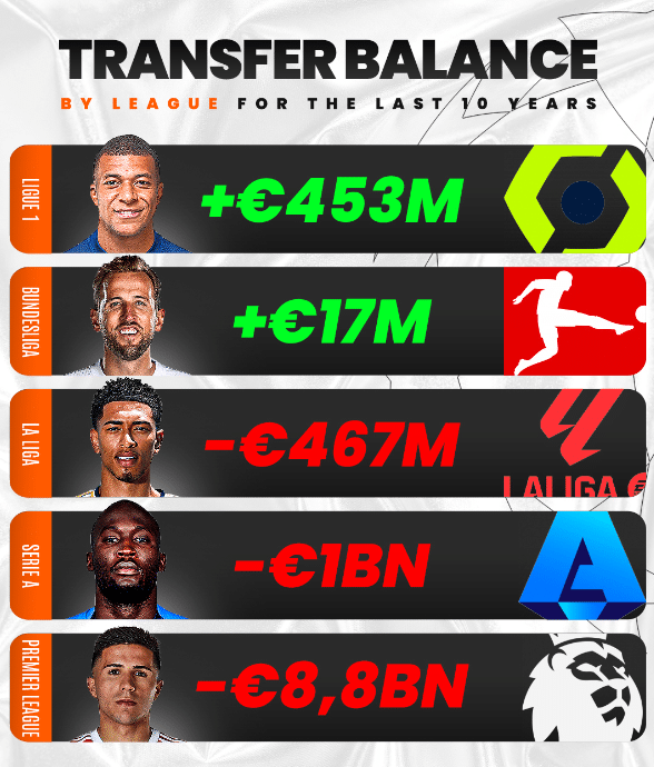 Of the top competitive leagues in Europe, only Ligue 1 and Bundesliga have a positive difference. The Bundesliga has a net spend of +€17 million while Ligue 1 +€453 million. This indicates that they receive more from selling players than from buying players. Serie A also has a significant deficit of -€1 Billion, followed by La Liga at -€467 million.