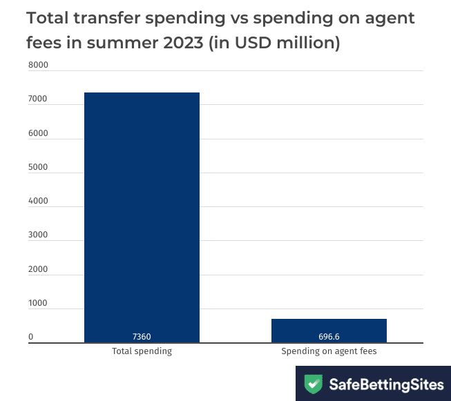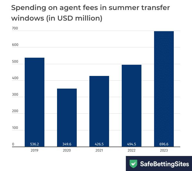As stated above, football clubs spent $696.6 million on agents in the summer window. This figure witnessed an increase of 41% on $494.5 million spent on agents in 2022. The figure also represented a 30% increase on the previous record figure of $536.2 million from the 2019 summer window.
