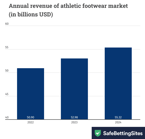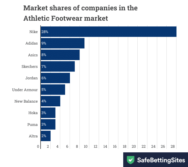 The athletic footwear market is a lucrative multi-billion market, expected to bring in $52.98 billion in revenue in 2023. US sportswear giant Nike currently possesses the biggest share of the market. According to the numbers presented by SecureBettingSites.com, Nike has a 28% share of the global athletic footwear market.