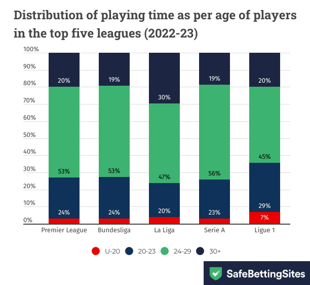 On the opposite spectrum, La Liga was responsible for giving the biggest chunk of game-time players aged 30 or more. Clubs in the top tier of Spanish football gave a significant 30% of playing time to such players.