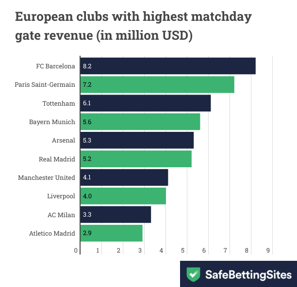Gate revenues on match days are one of the most important revenue streams for football clubs. According to the data presented by SecureBettingSites.com, Spanish giants Barcelona make the most revenue from matchday going fans in European football at $8.2m per home game.