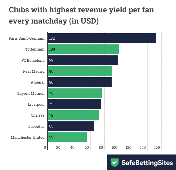 French giants Paris Saint-Germain blow the competition out of water when it comes to average yield from a match-going fan. PSG makes $152 from every fan every game on average. Thus, PSG has a high matchday income despite having a relatively small home audience.