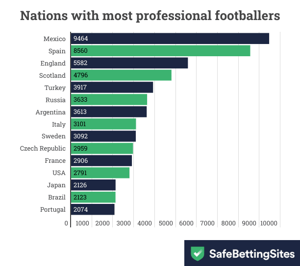 Europe and South America are undoubtedly the hotbeds of modern professional football. However, Mexico currently employs the most professional footballers. According to the numbers presented by SecureBettingSites.com, there are currently 9464 professional footballers plying their trade in Mexican football, more than any other nation.