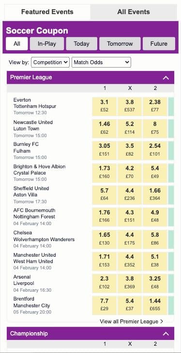 There is little difference between the format of BETDAQ exchange UK betting and BETDAQ fixed odds betting, aside from the prices being fixed so you are betting against the betting site as opposed to your fellow BETDAQ exchange users. All the same sports are available, and the same markets. You might find though that even though markets are available, they won’t have prices listed. This just means that BETDAQ is not currently accepting wagers for these individual markets.