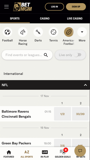 Live betting at BetMGM has its own section, which can be accessed via a button at the bottom of any page. This will bring up all the current live games taking place across the globe in football, tennis, basketball, cricket and eSports plus any other major events covering other markets.