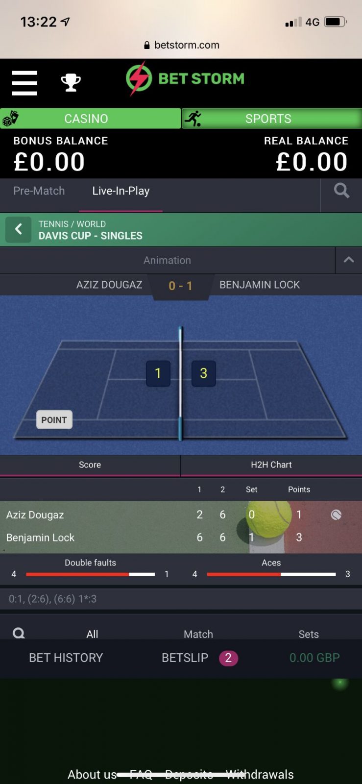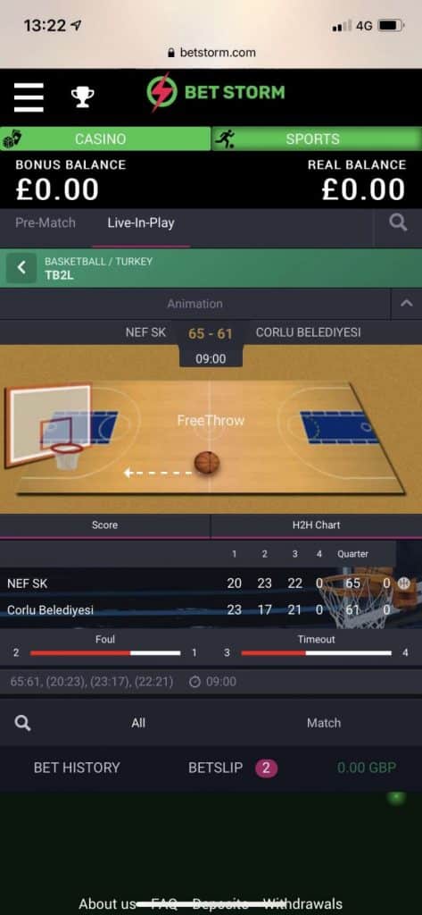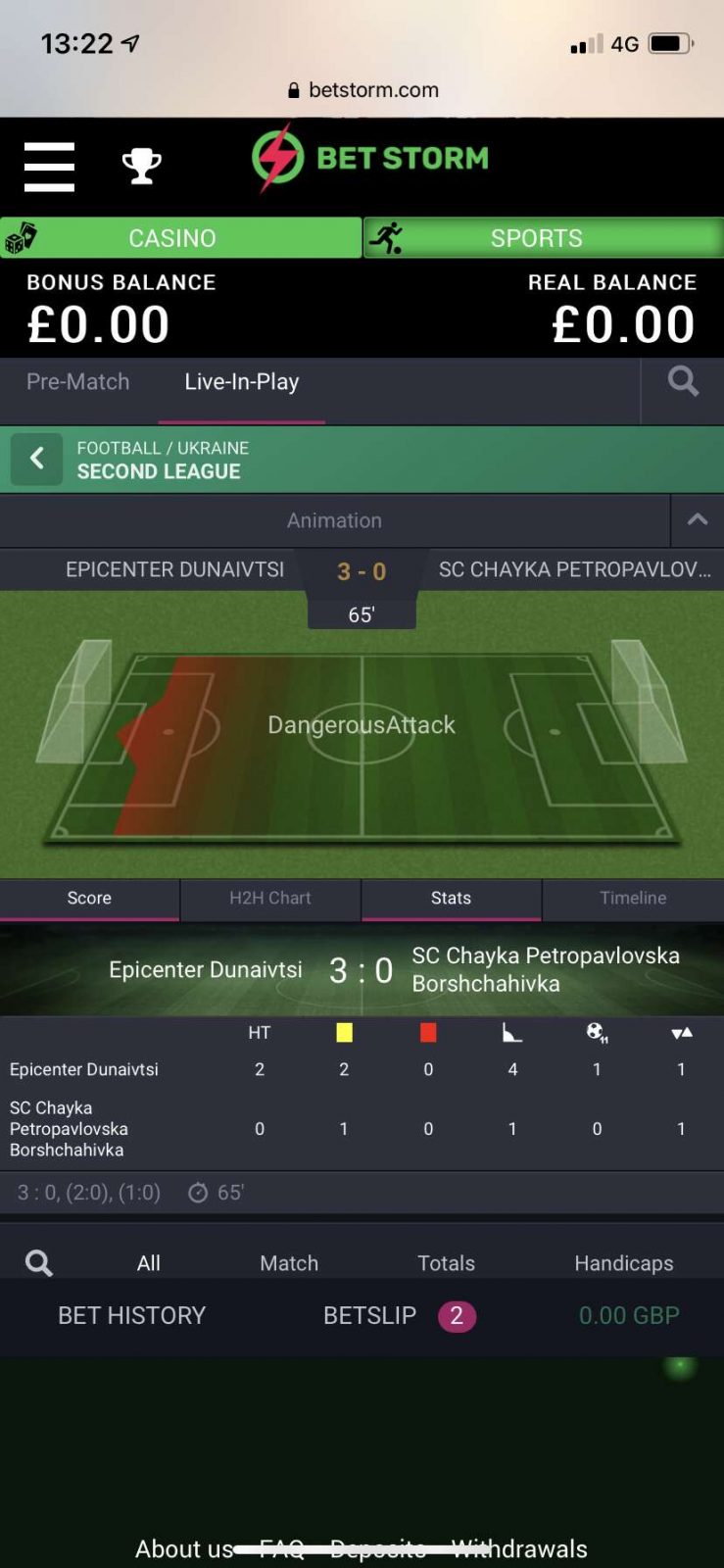 When we sat down to write this Bet Storm review, live streaming was not an option. However, the good news is that each live event comes with a bespoke graphic that shows the latest score. The Bet Storm live football betting service is also enhanced by the presence of a live animation with regularly updated text telling you what’s happening, along with key statistics such as shots, shots on target, passes, bookings and corner kicks.