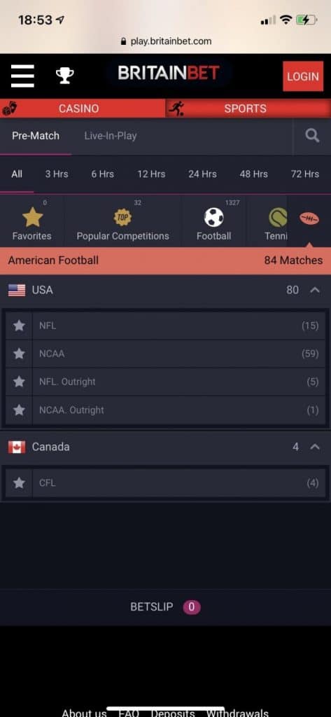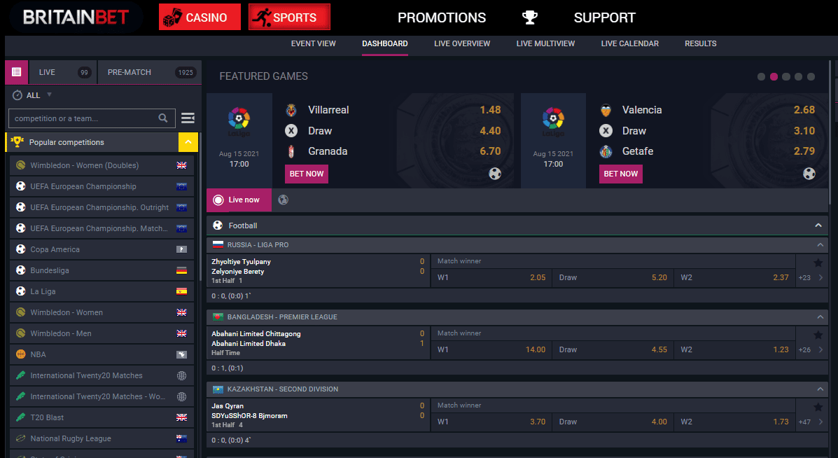 It may seem at first glance like the layout of BritainBet is quite cluttered, but we actually found placing a wager to be really easy. Once you click on a particular sport, the specific matches relating to that sport will appear right next to it. Once you click on an event all the markets will be to the right of that.