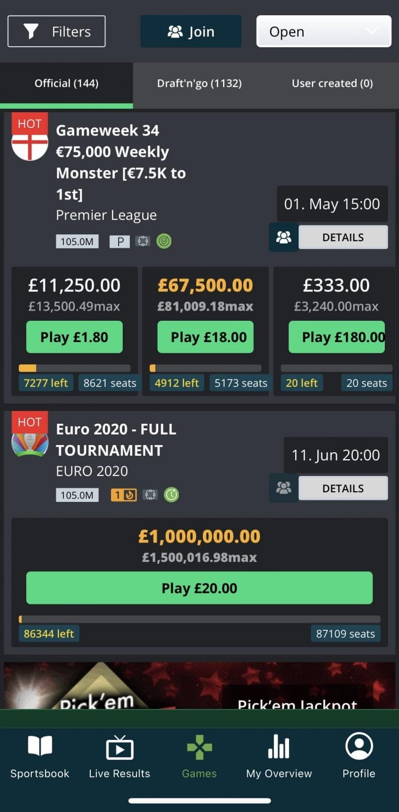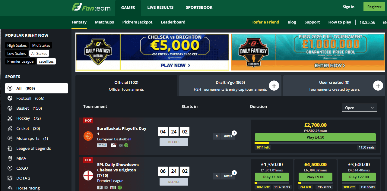 You access these through the lobby area and decide upon the sport you want to play. Stakes are available that suit all budgets, ranging from £2 and upwards to £200 or so. Just utilise the green button featuring the buy-in price that suits your bankroll. If you’re betting on football, then you’ll go to a page specifically catering to this and vice versa for other sports.From there, you pick your team, with midfielders, defenders, goalkeepers and strikers being available. Popular players like Mo Salah, Raheem Sterling, Bruno Fernandes, Harry Kane and others can all be chosen from.