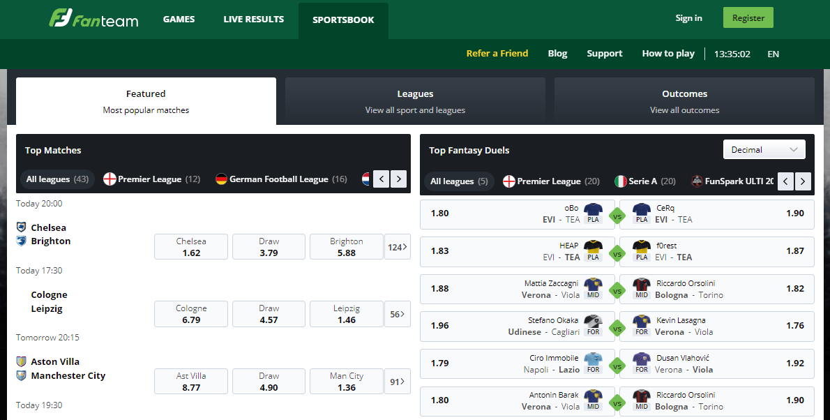 If you would like to engage in more of a solid sportsbook gambling activity, then this is also possible at FanTeam. Clicking on the ‘Leagues’ link will allow you to see each of the sports and associated leagues that you can place wagers on at the site. For the time being, its sports betting options are restricted to football, hockey, basketball, cricket and baseball. Within these sports though, you will find popular leagues to gamble on, including the Premier League, NBA, European Basketball, La Liga and India T20, to name but a few.