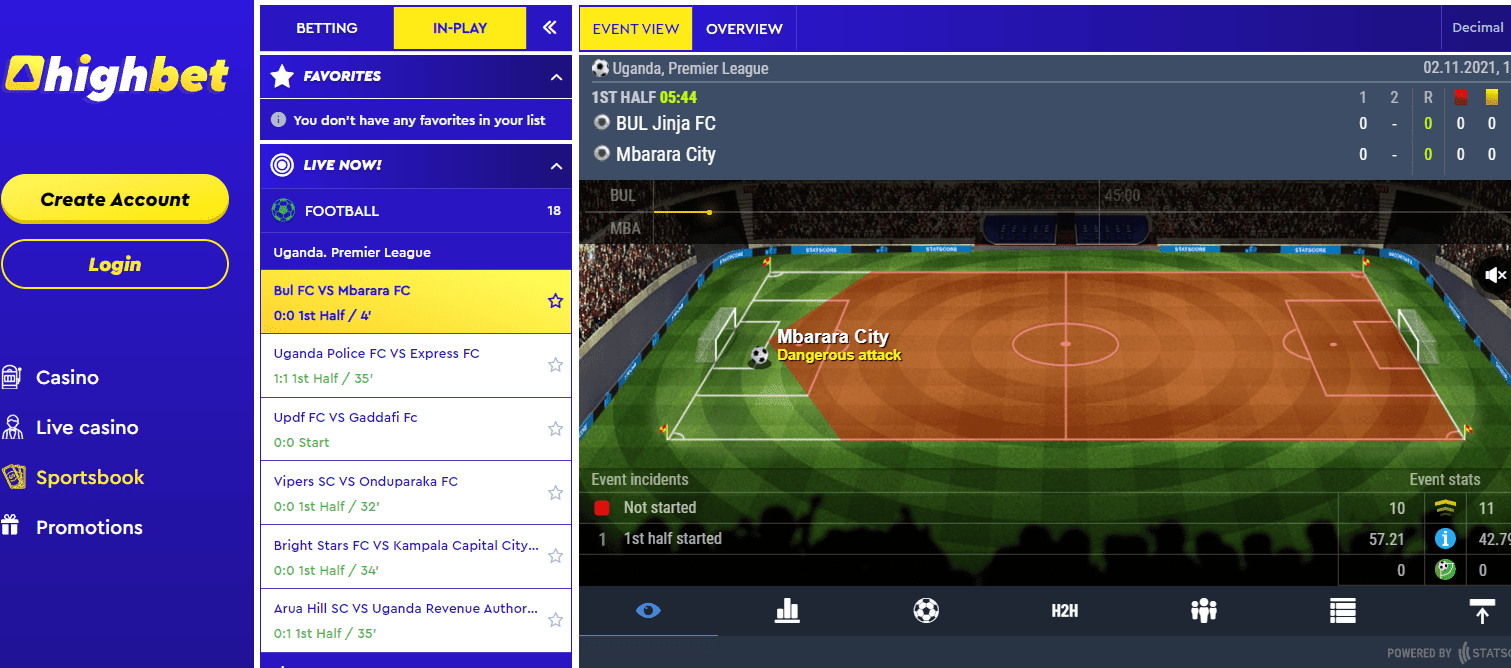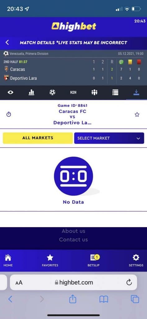 At the time of writing this Highbet review, we found that live streaming was not an option, but what we did find was that every sport that you can bet on in play had a nice looking graphic showing the latest score and key stats from the game. In addition, for a lot of sports, there were live animations showing events as they happened, along with key stats such as shots on target, bookings, corner kicks and even dangerous attacks.