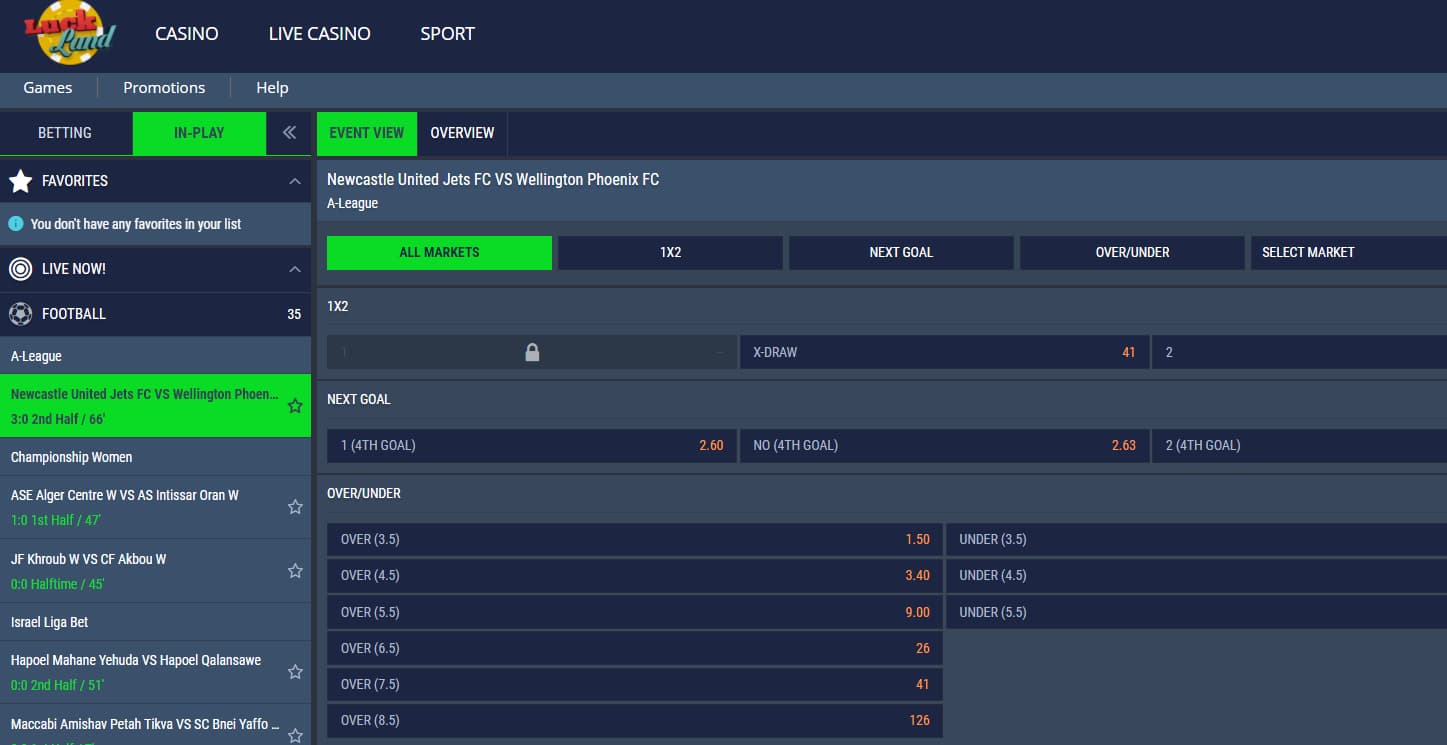 LuckLand has a fine live betting or in-play betting setting and it is easy to flick between the live betting and pre-event betting pages via the menu on the left-hand side. All the up-and-coming events will be now on display, with the biggest events towards the top of the screen.