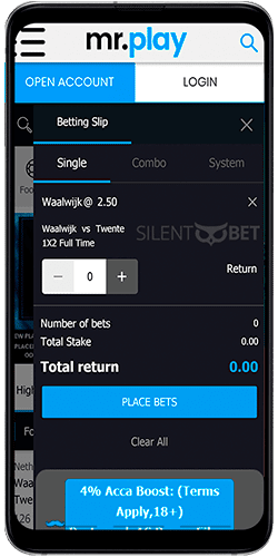 Again, with that welcome bonus in mind, put on a £10 qualifying sportsbook bet on Mr Play. This needs to have minimum odds of Evens (2.00) and be settled within 14 days of opening your account. If these key terms aren’t met, then you won’t get the free bets. Adding wagers to the betslip is easy. Just click on the odds from the market you want and they appear on the slip on the right-hand side of the sportsbook. Enter your stake and then hit the blue Place Bets bar.