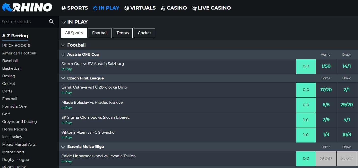 There are plenty of in-play markets available at the Rhino Bet sports betting site. Just click along via the top menu to the ‘In Play’ section for the latest live events. These are usually presented in sequential order, although the bigger markets and events do get priority.