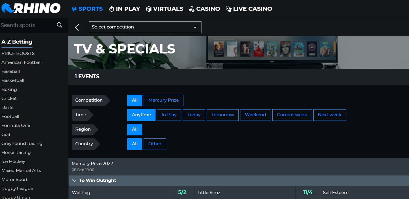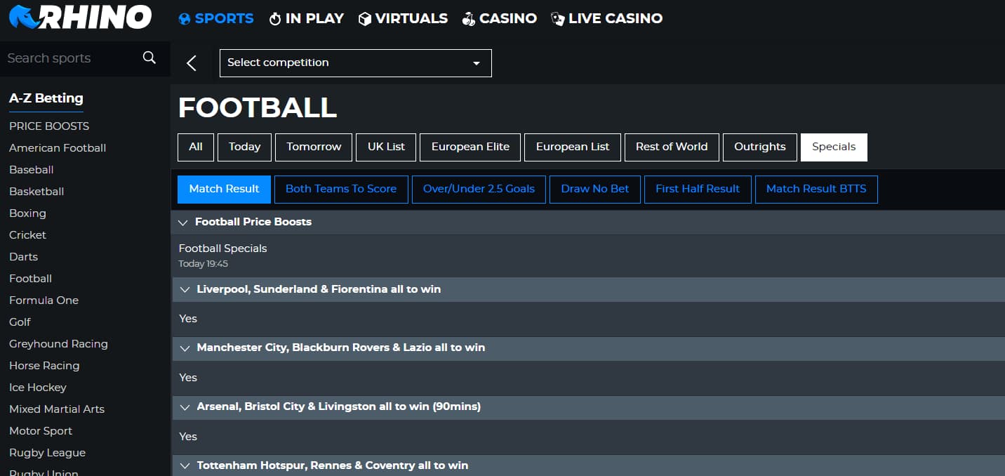 Football bettors do not have to feel that they’ve been forgotten, though. Football is one of the options available via Rhino Bet’s left-hand menu, available alongside US sports, cricket, darts, golf, rugby (both codes) and others.