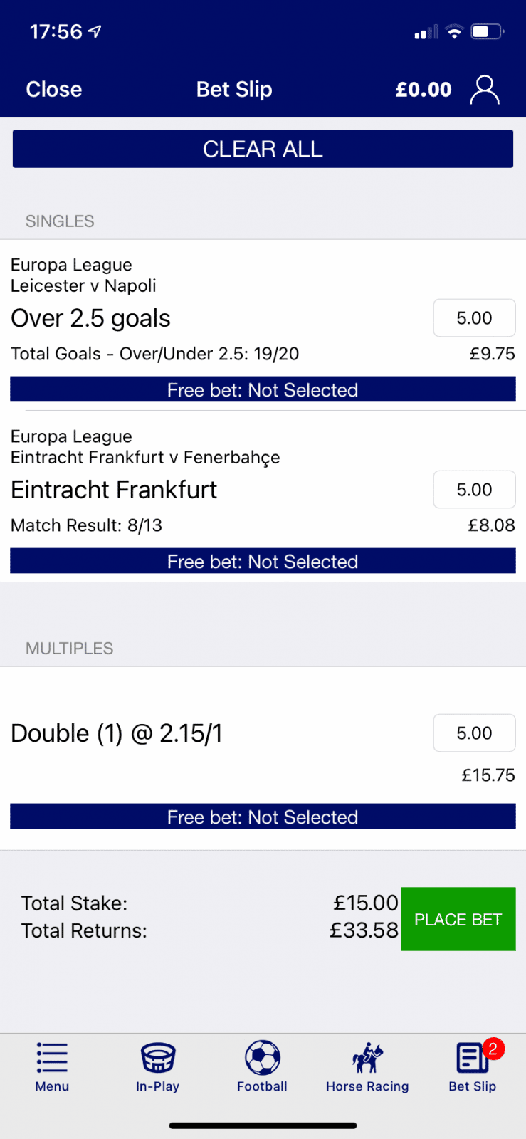 Create a Bet is a nice option if you want to construct your own multiple bets on a particular football match. After you’ve clicked on a certain game you will see the Create a Bet option at the top and once you have clicked on it you will be able to add different markets such as match result, total goals and first goalscorer to your accumulator, giving you total control over what you bet on.